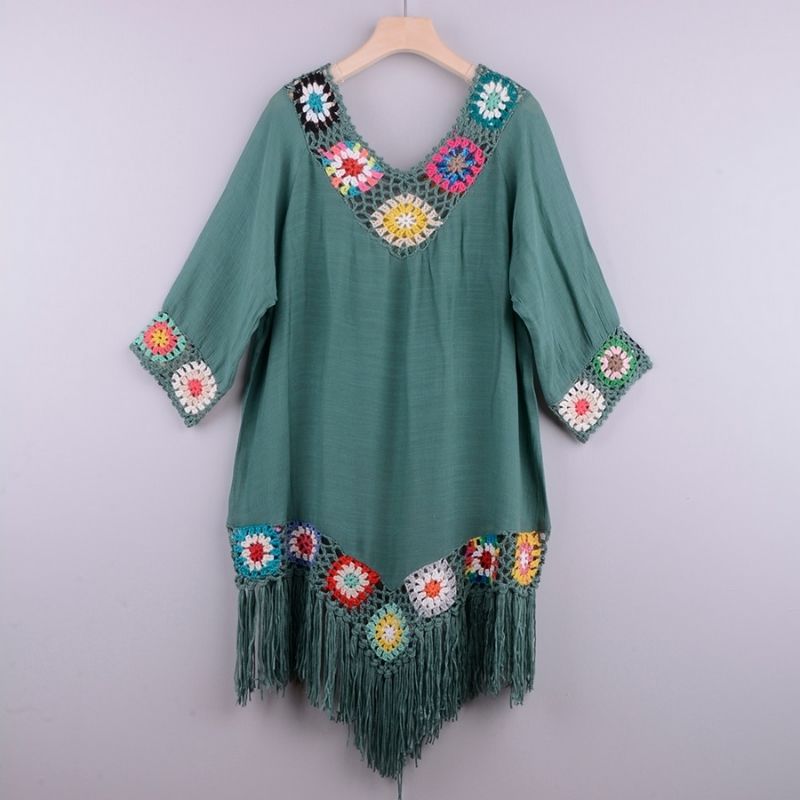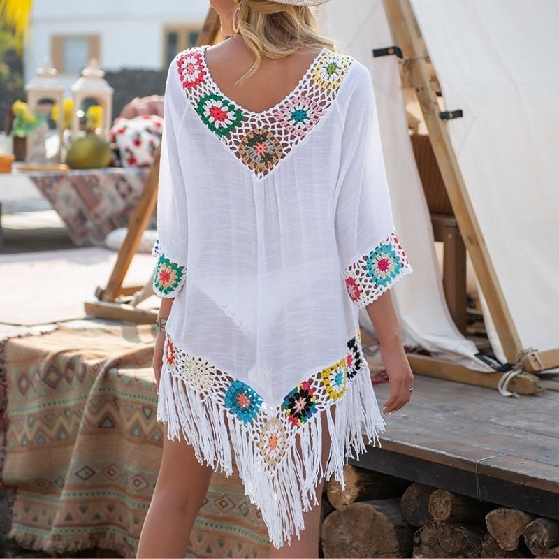 Women's Boho Beach Cover-Up - Lightweight Crochet Tunic - V-Neck, 3/4 Sleeve, Fringe Hem