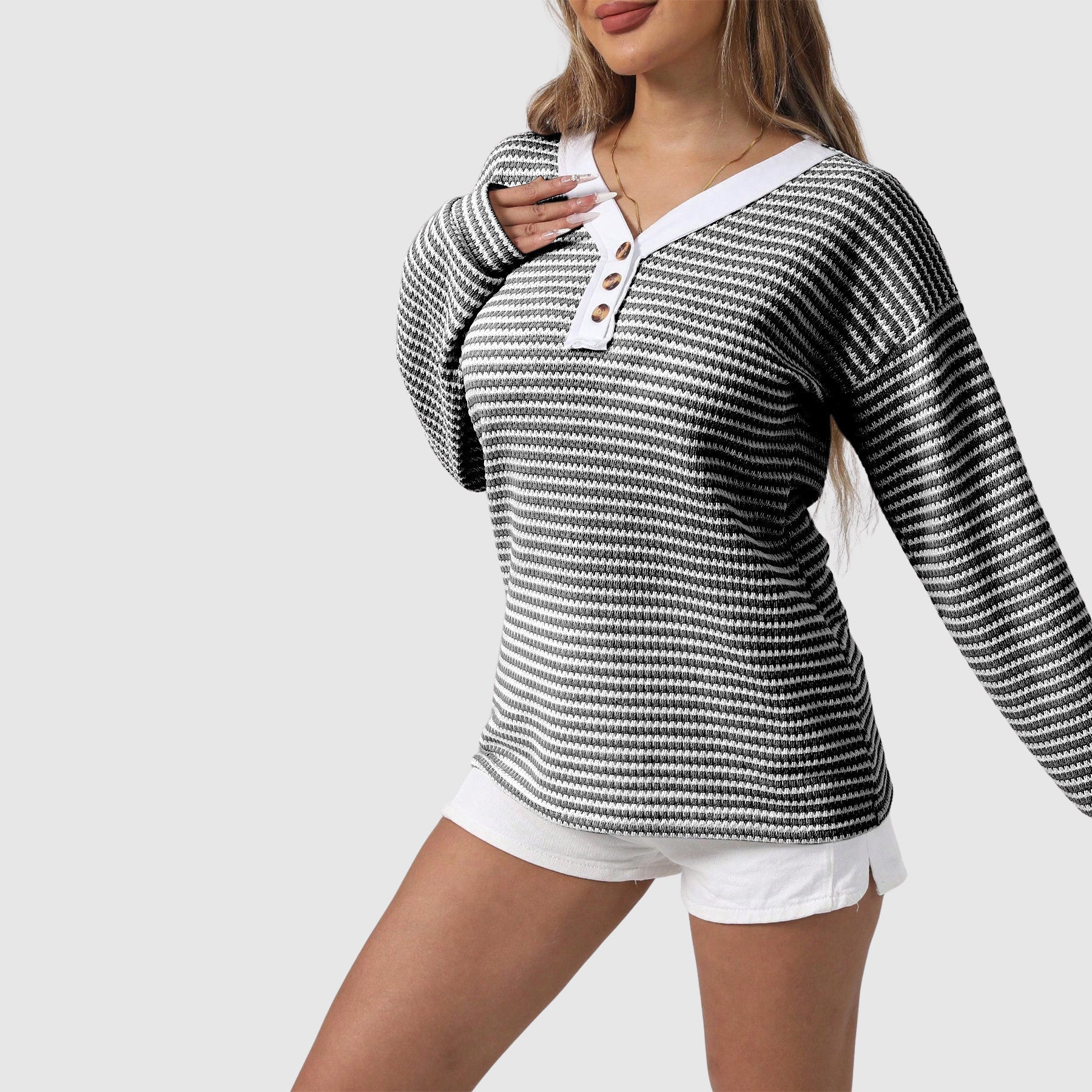 Embrace relaxed comfort with the Elisa Tunic-Length Sweater, designed for a relaxed fit that drapes gracefully. This striped V-neck piece features a distinctive button placket, adding a touch of refined detail. Perfect for casual gatherings, its long-sleeve, tunic-length design offers versatile styling for everyday ease.