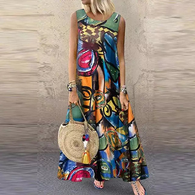 • Design: Sleeveless Maxi Dress with Abstract Pattern