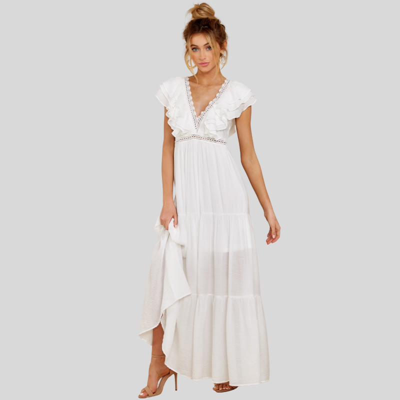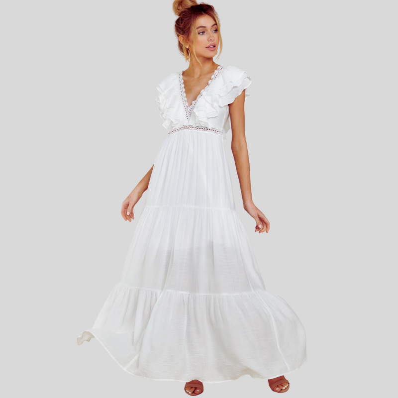 Flow into summer elegance with this Women’s Maxi Dress - V-Neckline - Short Ruffled Sleeves - Tiered Flowy Skirt. This airy, lightweight maxi dress features a flattering V-neck, short ruffled sleeves, and a tiered, flowy skirt, perfect for warm weather and making a statement.