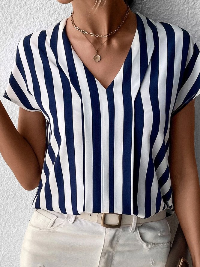 Women's Blouse - V-Neck Short Sleeve - Vertical Stripe Lightweight Casual Wear
