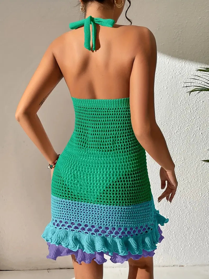 Women's Crochet Mini Dress - Halter Neck - Fitted Waist - Ruffled Hem - Lightweight