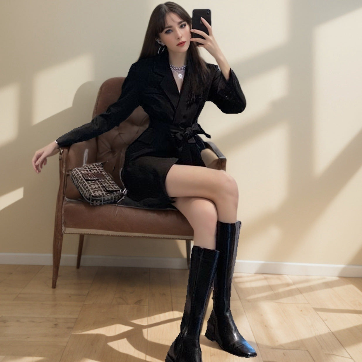 Women’s Blazer – Slim Fit – Waist Tie – V-Neck – Mid-Length – Long Sleeve Tailored is a must have by Olivia Johnsen! This tailored blazer boasts a slim fit, flattering V-neck, and a waist tie for a defined silhouette. The mid-length cut and long sleeves make it perfect for creating elegant and powerful looks.
