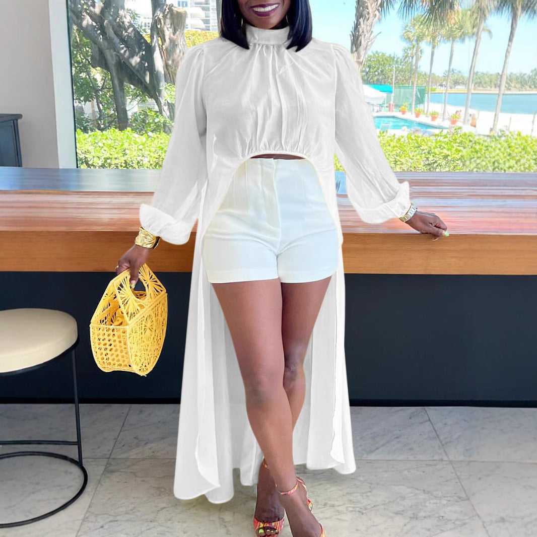 Elevate your wardrobe with the exquisite Women’s Blouse – Sheer Chiffon – High Neck – Puffed Sleeves – High Low Hem. This elegant sheer chiffon blouse features a chic high neck, fashionable puffed sleeves, and a flattering high-low hem, perfect for modern style.