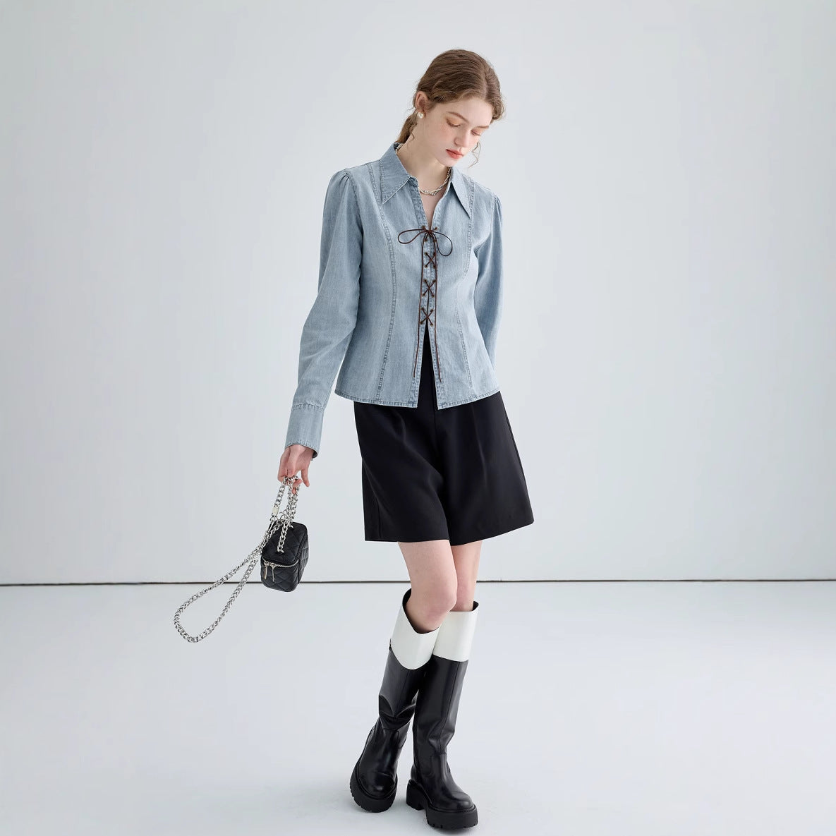 Women’s Denim Shirt Jacket – Tailored Fit – Lace-Up Front – Structured Long Sleeve