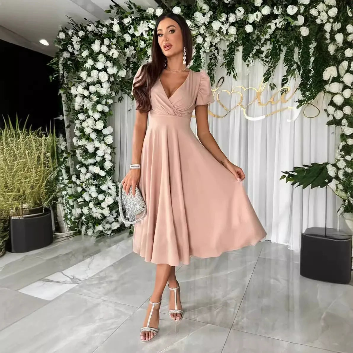 • Design: Fit and Flare with V-Neck and Short Puff Sleeves