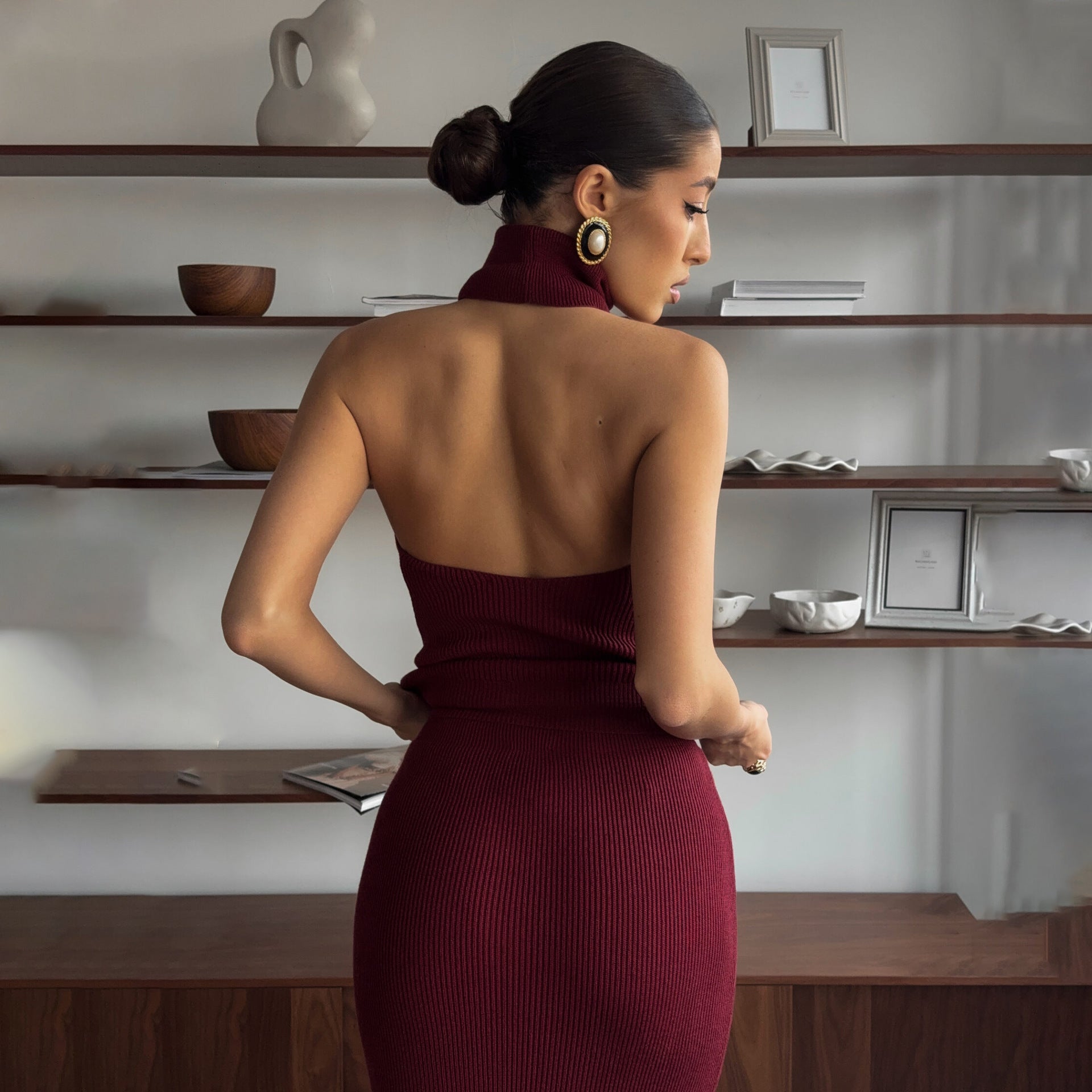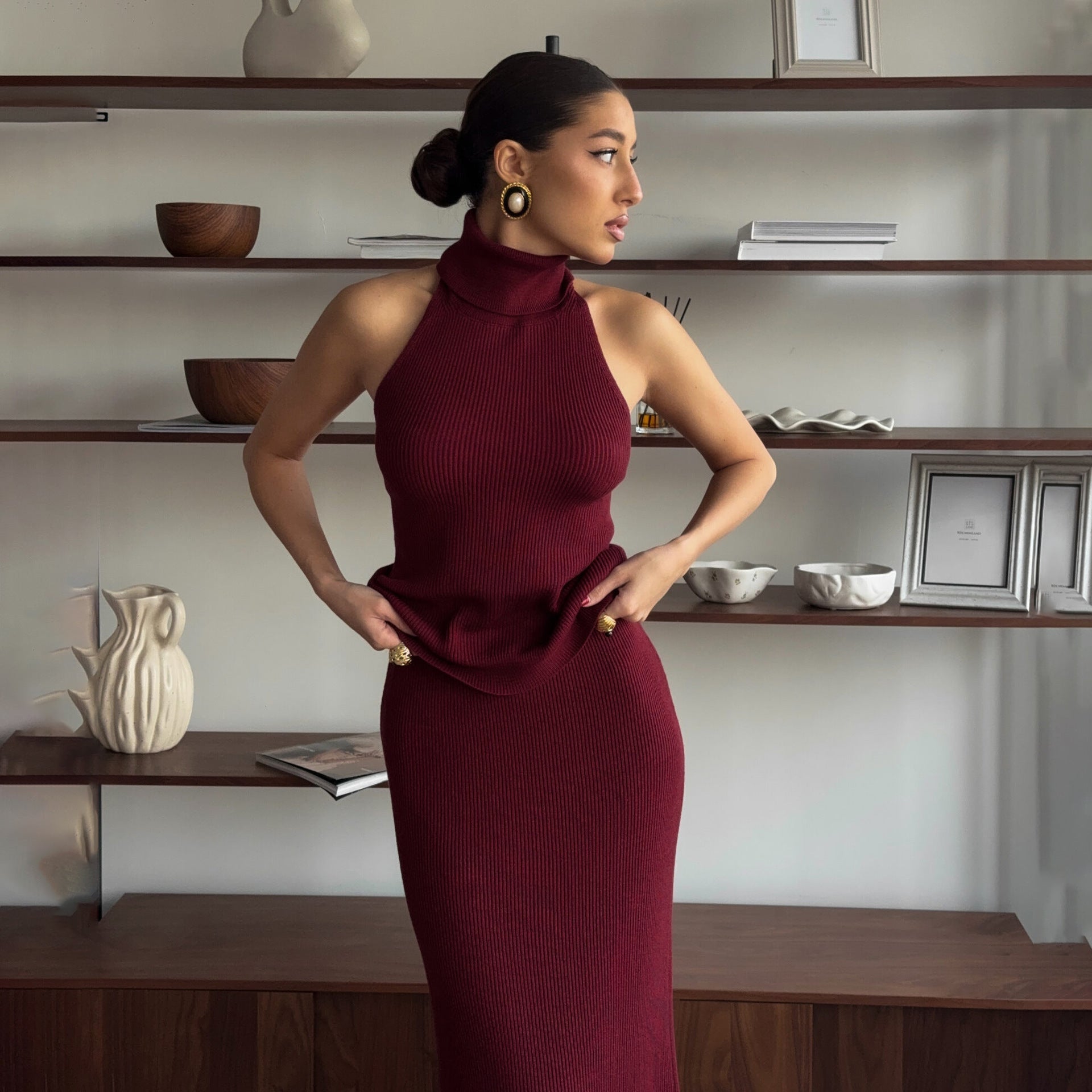 Women’s Midi Dress – Slim Fit Ribbed Knit – High-Neck Halter – Backless Sleeveless