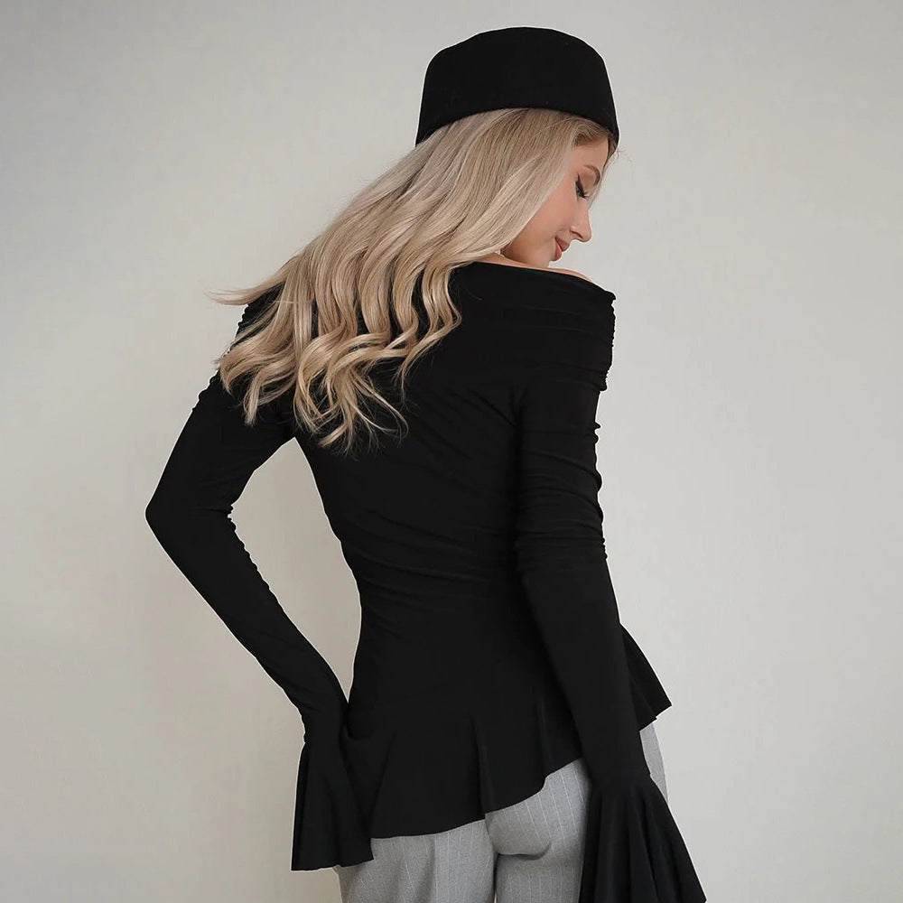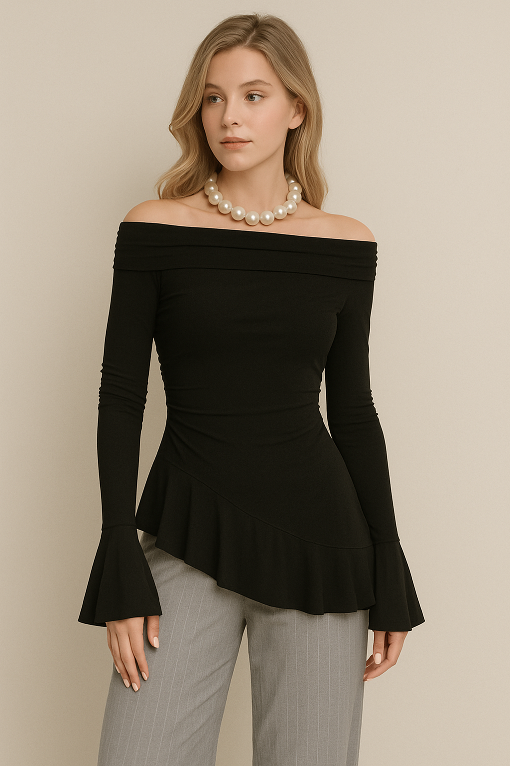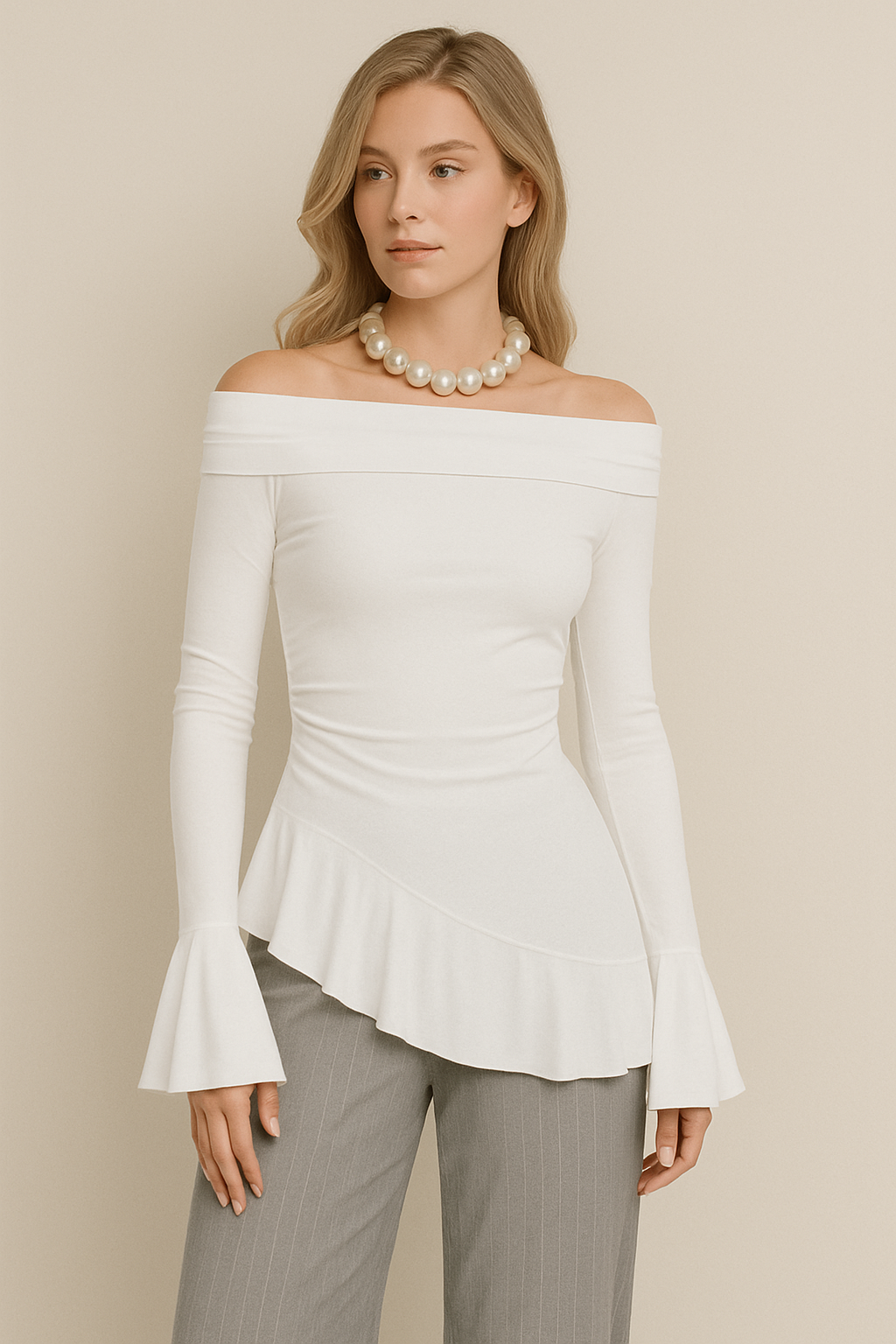 Women’s Off-Shoulder Top – Slim Fit – Ruffle Sleeve – Stretch Comfort Fabric